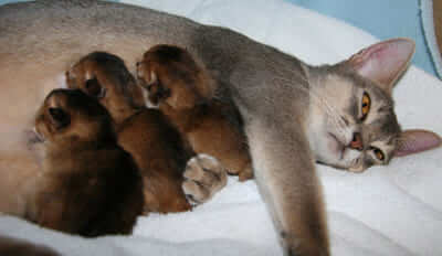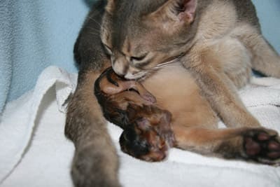 Alcune gatte allattano immediatamente i cuccioli appena nati, altre li ignorano fino a parto ultimato. I tempi di espulsione tra un gattino e l’altro possono variare da pochi minuti fino anche a un’ora. Onde evitare che la gatta schiacci i cuccioli è consigliabile servirsi di una cesta supplementare (munita di cuscino e relativo lenzuolo o traversina assorbente), dove si sistemerà una boule di acqua calda (opportunamente foderata) o un termoforo, sulla quale si adageranno i cuccioli subito dopo la nascita, ricoperti da un altro lenzuolino per tenerli al caldo e permettere alla gatta di potersi muovere agevolmente nella sua cesta.